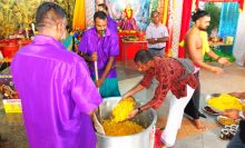 The panchamirtham (five divine nectars) was made by mixing a variety of cut fruits, nuts, honey and ghee, weighing a total of 51 kg. It was offered to Lord Murugan at the event organised by Ayya Singai Muniyandi (ASM) on 16 Dec 2018 near to Block 140 Lorong Ah Soo. The panchamirtham was later packed into small containers and distributed to devotees.