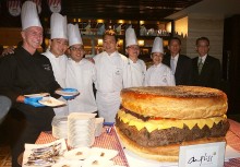The chefs at Triple Three, Mandarin Orchard Singapore created the largest hamburger weighing about 100 kg. It was made using over 60 kg of beef, 100 whole eggs, 15 kg of flour and 5kg of onions. It measured 82cm in diameter and was 40cm high. The record was planned to tie-in with the launch of the hotel’s Great Big American Buffet on 9 ...