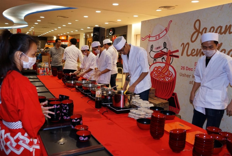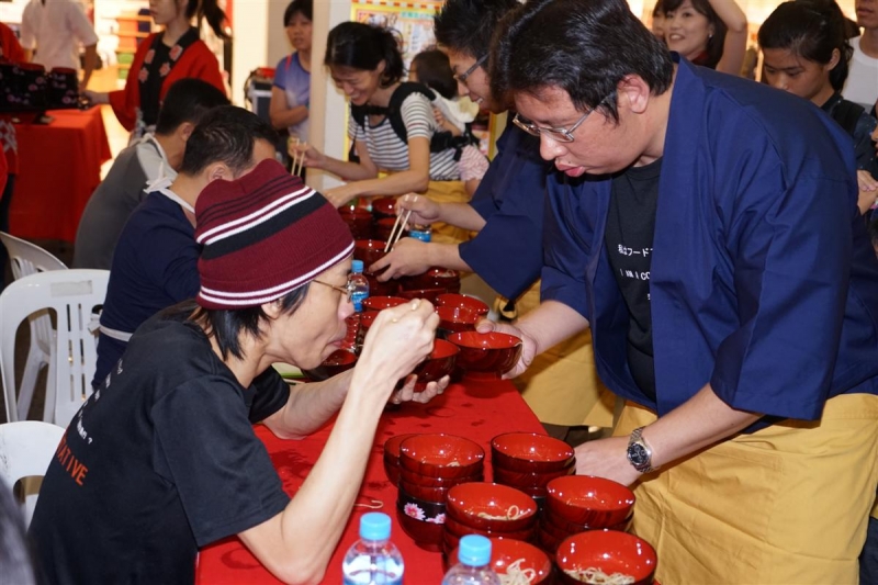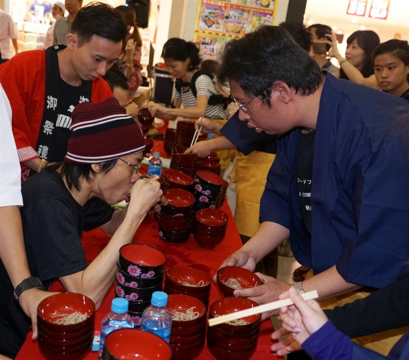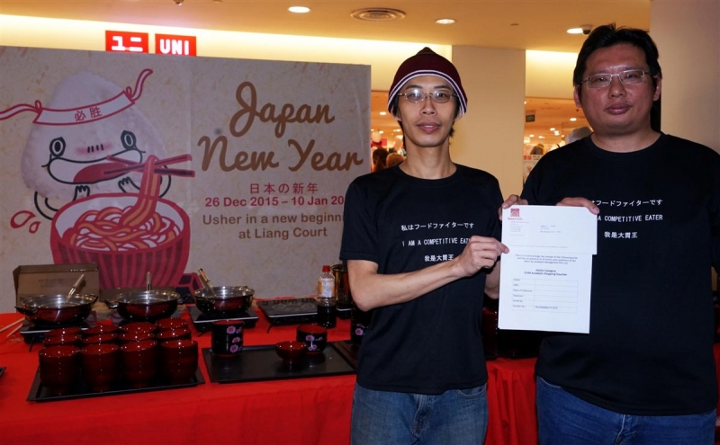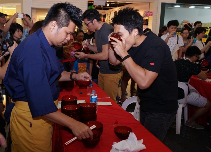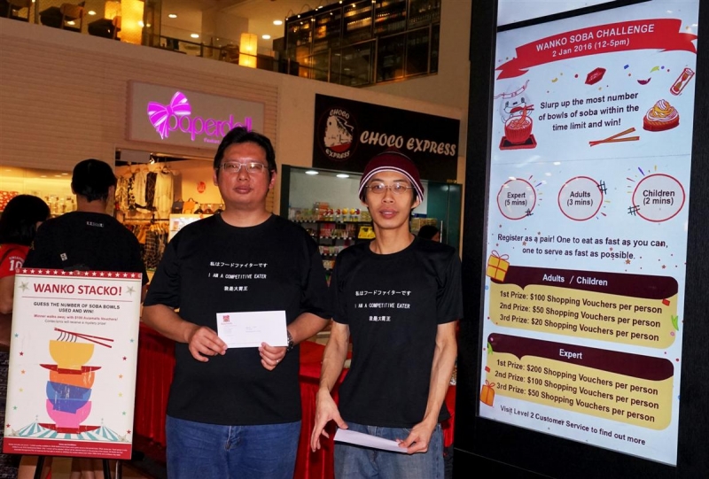 Wanko Soba is traditionally served by the Japanese host in many small bowls until the guest is satisfied. To wish for an abundant new year, Liang Court organised a wanko soba eating competition on 2 Jan 2016, where as one eats, another will be continually topping his bowl with the noodle. After four rounds of competition, Ng Chin Sheng emerged as the record setter with 66 bowls in 3 minutes.