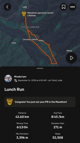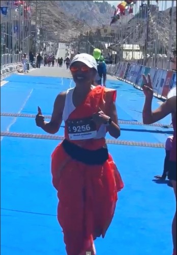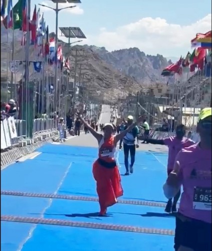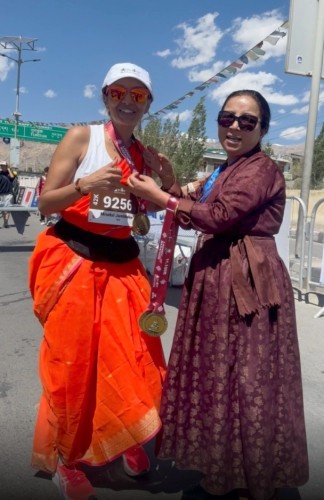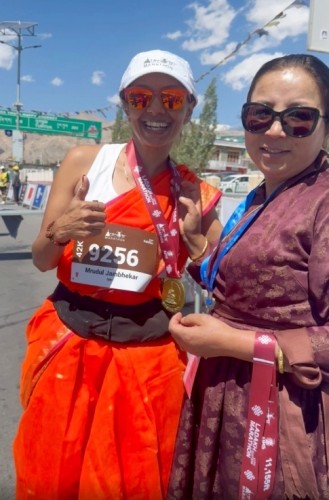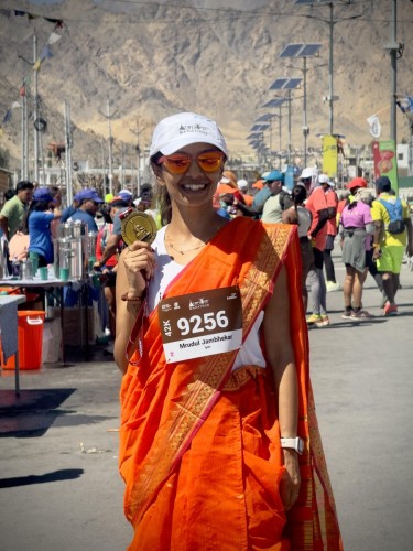 Yoga instructor Mrudul Jambhekar Iyer, 49, took part in the Ladakh Marathon wearing a 9-yard nauvari saree on 14 Sep 2025. It claims to be the highest marathon in the world, held at undulating heights of 3,505m to 5,370m. At the higher altitude, the oxygen level was about 60% that of sea level and she completed the full marathon in 6 hr 13 min. This was her seventh marathon, the first in 2019.