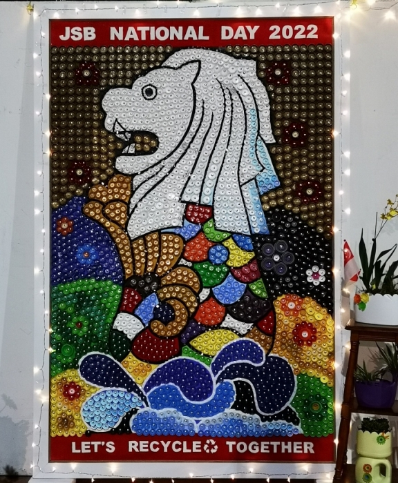 Volunteers from Jurong Spring Zone B Residents’ Committee collected used plastic bottle caps to create a merlion artwork for National Day. Measuring 1.9m by 1.4m, over 3,000 bottle caps were held by thumb tacks on a board. It debuted at its stage show at Jurong West St 41 on 30 Jul 2022.