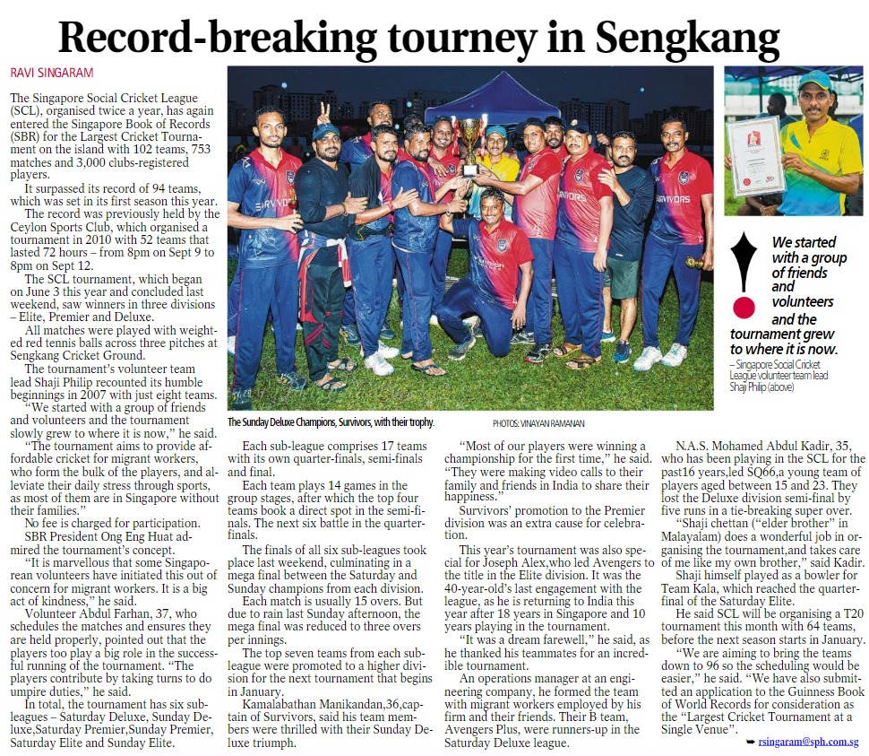 From 3 Jun to the finals on 26 Nov 2023, 102 teams played 750 matches on weekends at the Sengkang Cricket Ground. Teams were divided into 6 groups and they competed round-robin style within their groups. Based on their league standings, the teams moved towards the finals by knockouts. The games were organised by Singapore Social Cricket League, a voluntary group reaching out to Indian migrant workers. It broke its own record with 94 teams held in the first half of the year.