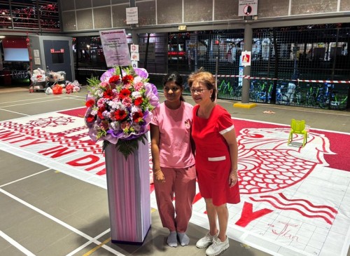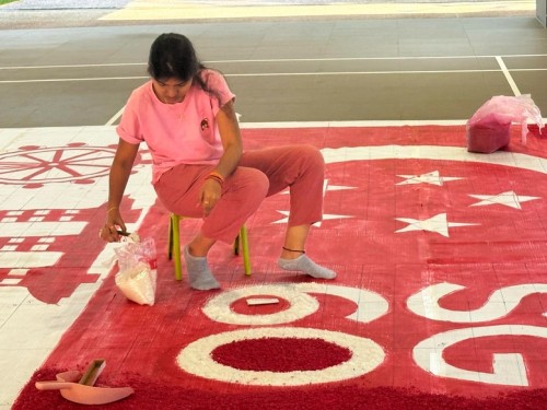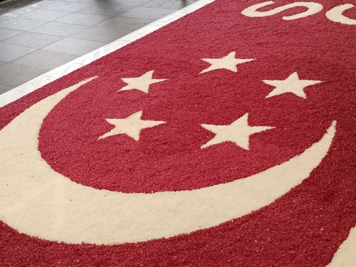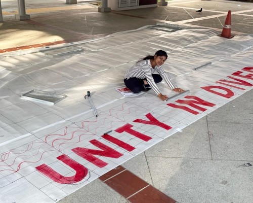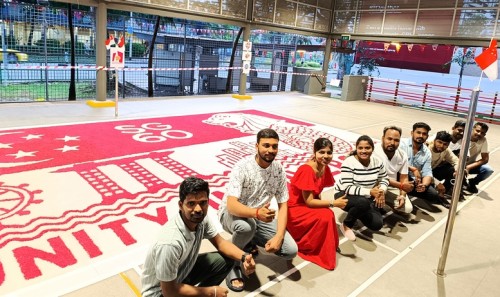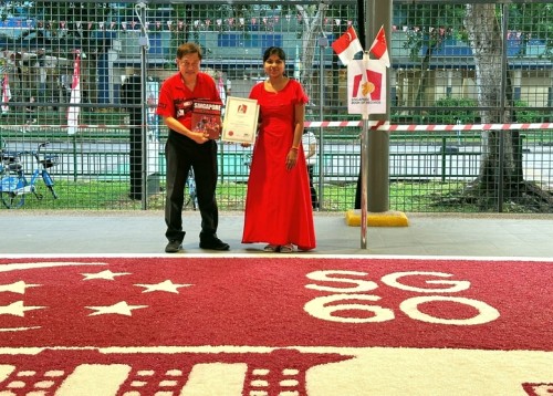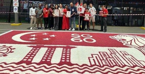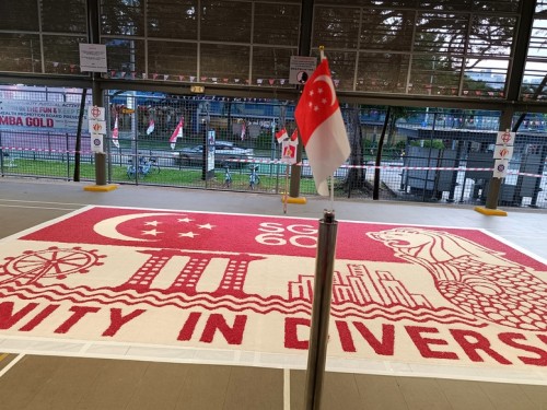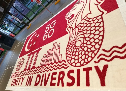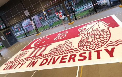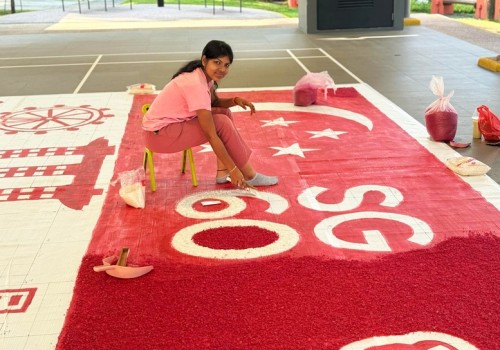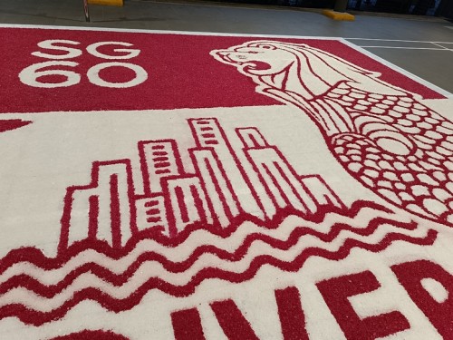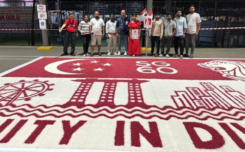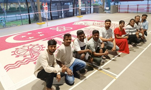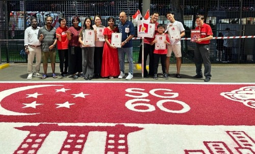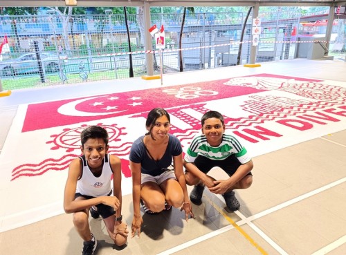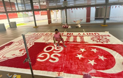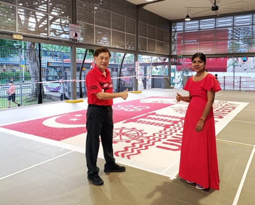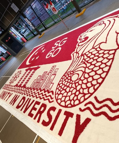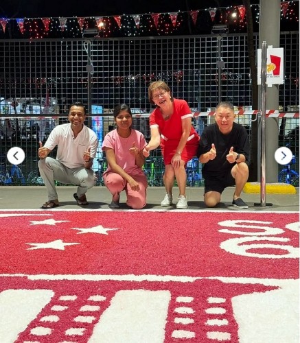 To commemorate Singapore’s 60th National Day, Janani Mourougane, a 27-year-old electrical engineer, created a 4.5m-by-7.5m artwork entitled ‘Unity in Diversity’. It was displayed at Kent Ville RN’s Block 51 pavilion on 3-5 Aug 2025. She used 350kg of dyed rock salt to depict the Singapore flag and iconic landmarks.