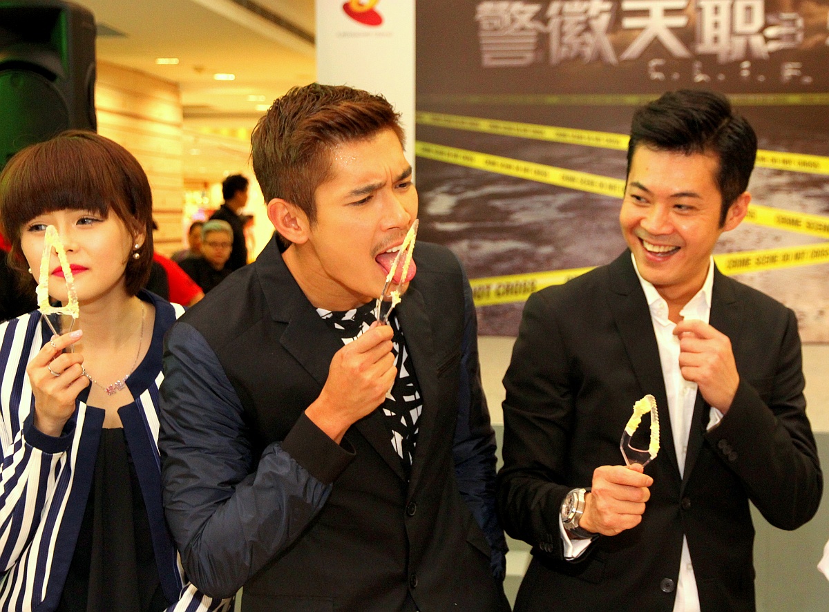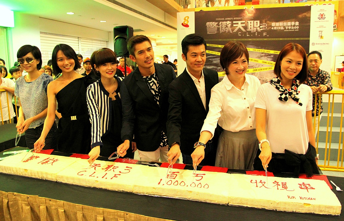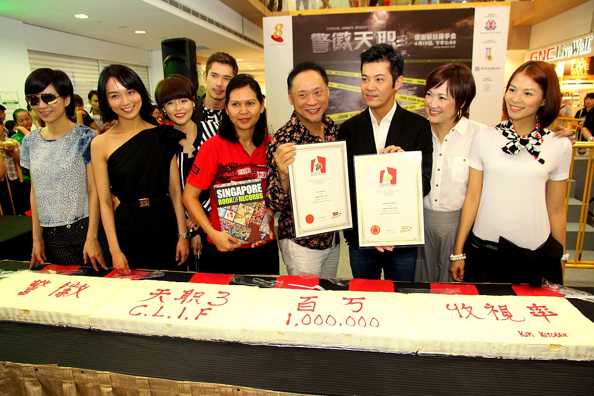 On 19 Apr 2014, the cast of MediaCorp’s CLIF 3 was at West Coast Plaza to meet fans. CLIF 3 (Courage, Loyalty, Integrity, Fairness, or 警徽天职3), a police drama series currently showing on Channel 8, managed to draw more than a million viewers. To celebrate this, Kim’s Kitchen, one of Singapore’s most renowned meals delivery companies, presented a durian cake measuring 2.35m by 0.31m which was later cut and shared with all present.