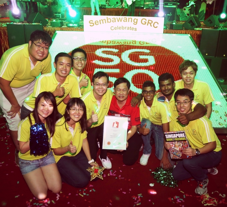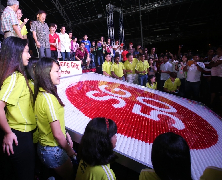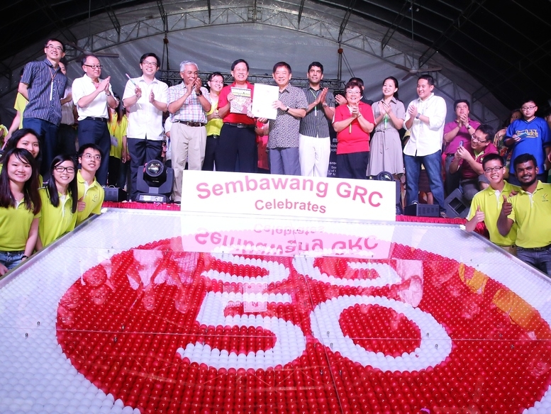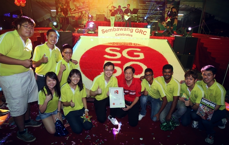At Sembawang GRC Countdown 2015, after the display of fireworks at midnight, a huge SG50 logo was unveiled to mark the beginning of Singapore’s Jubilee year. The logo made of 7,744 red and white table tennis balls (88 rows by 88 columns) measured 3.5m by 3.5m. The logo was built by the Woodlands Galaxy CC Youth Team.