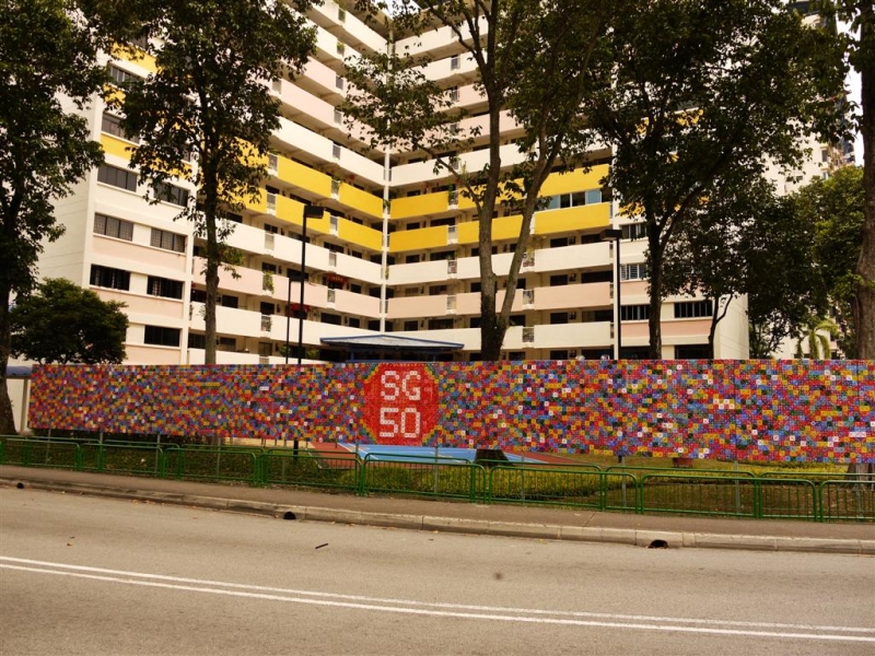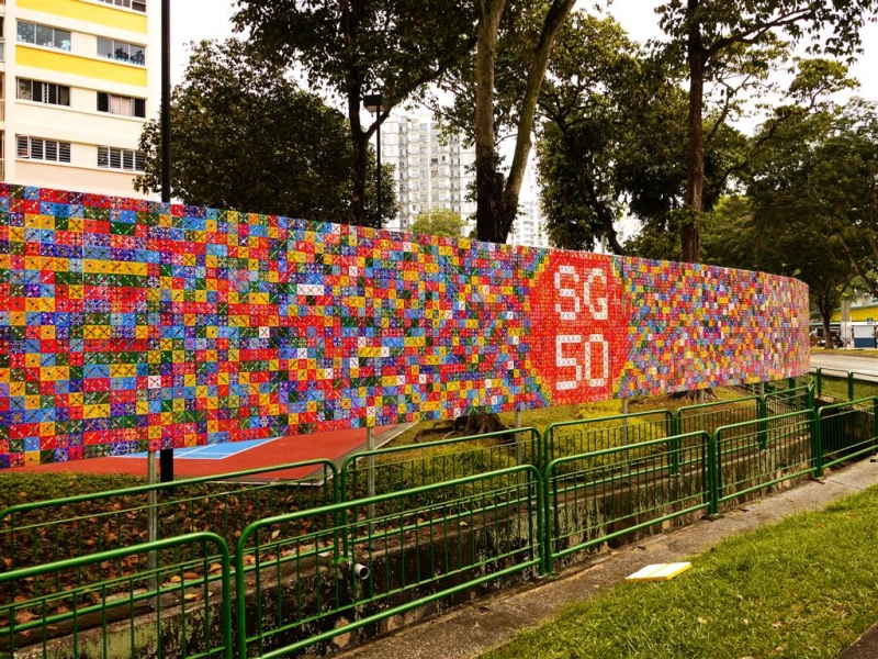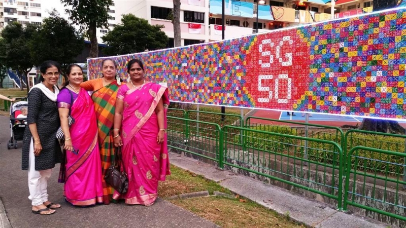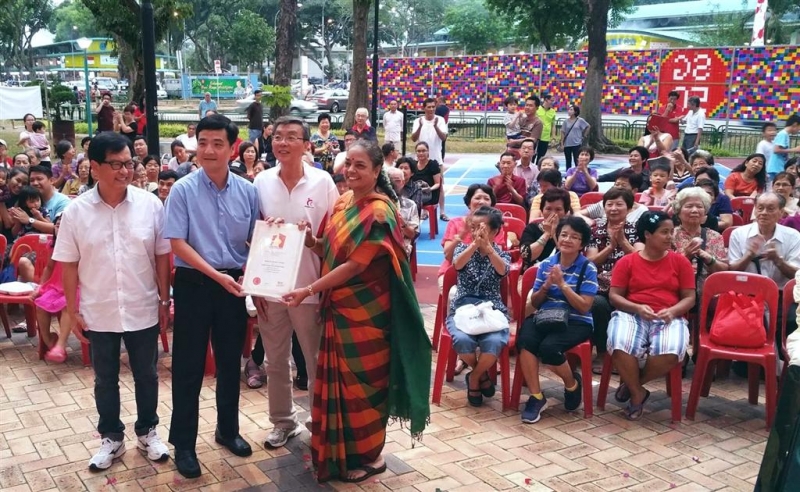 Whampoa View RC got residents and the nearby schools to help build a 2.1m by 26.5m montage fronting Whampoa Drive for the National Day celebrations. Participants drew and glued on small colourful translucent pieces of plastic on about 5,000 pieces of acrylic sheets. These were later stringed and mounted on a frame. The SG50 Rainbow Rangoli project was led by Mrs Vijaya Mohan and officially lighted up on 2 Aug 2015.