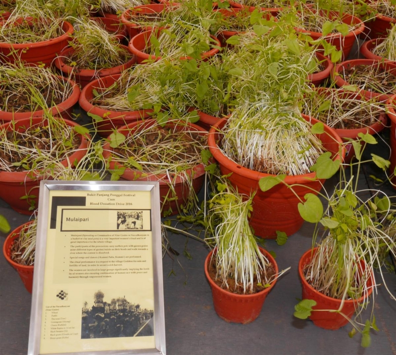 For the Bukit Panjang Pongal Festival on 17 Jan 2016, 115 potted plants were prepared 2 weeks earlier for the Mulaipari. In this traditional ritual, women devotees took part in a procession carrying the pots filled with seedlings of 9 different types of grains. The festival at Pending Road was organised by the Bukit Panjang CCC and INC.