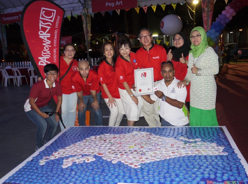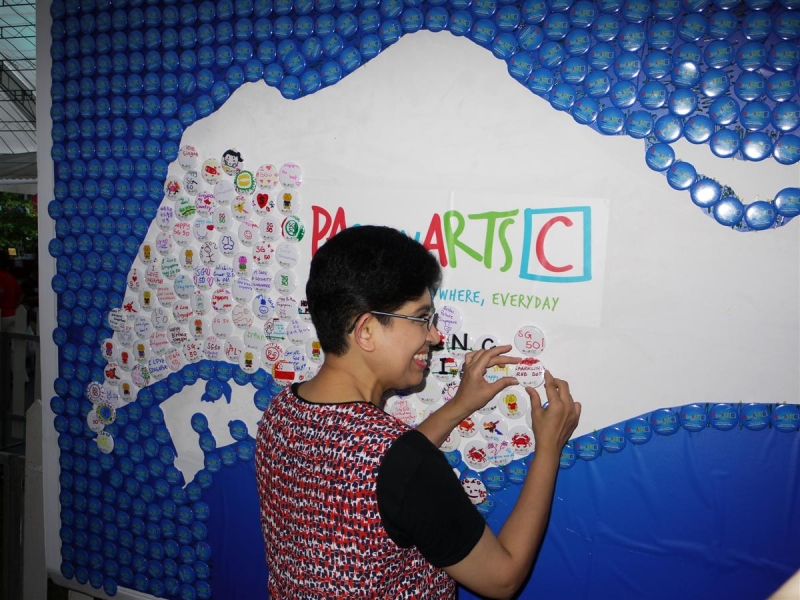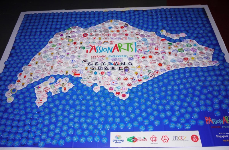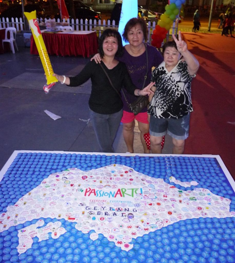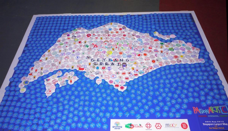 Geylang Serai CC held a carnival near to the Paya Lebar MRT station to reach out to the community using arts-related activities. In one of these activities on 30 Aug 2015, participants got to write or draw on small pieces of paper which were then pressed into badges. The badges were then placed on a board depicting the map of Singapore, measuring 1.5m by 2m.