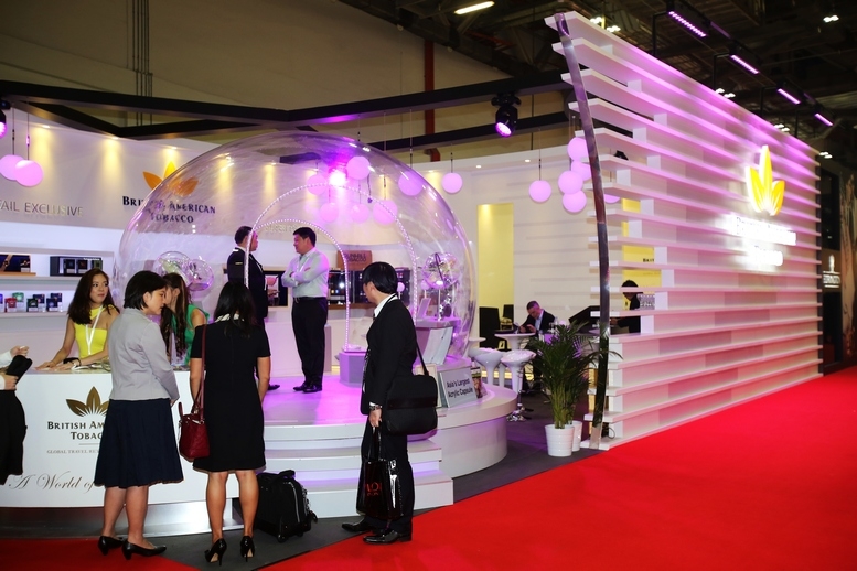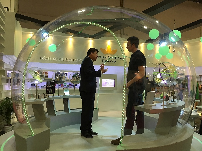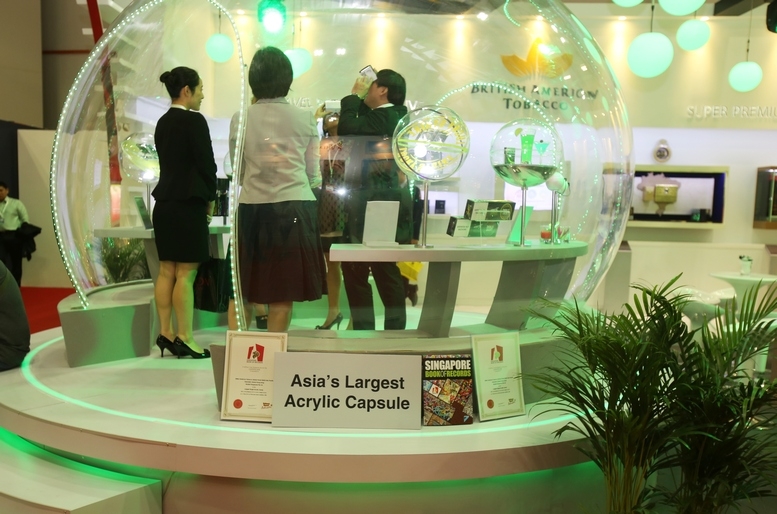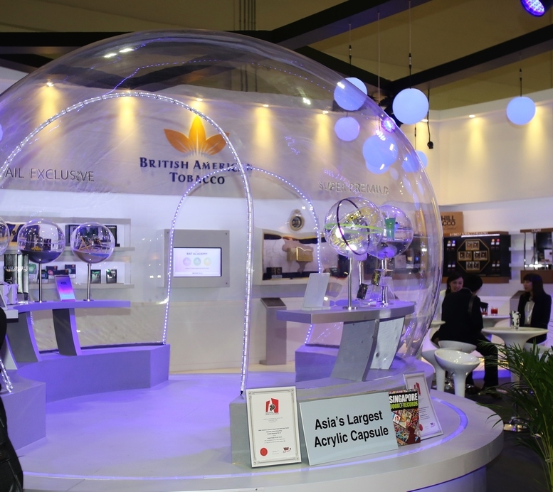 British American Tobacco commanded an outstanding presence at the TFWA Asia Pacific exhibition for duty-free products on 12-14 May 2015. Its area includes a transparent dome of 11.2m circumference and a height of 2.23m. The dome was shaped from a single piece of acrylic sheet. It was designed by Geometry Global (Hong Kong) and built by Maxibit Singapore.