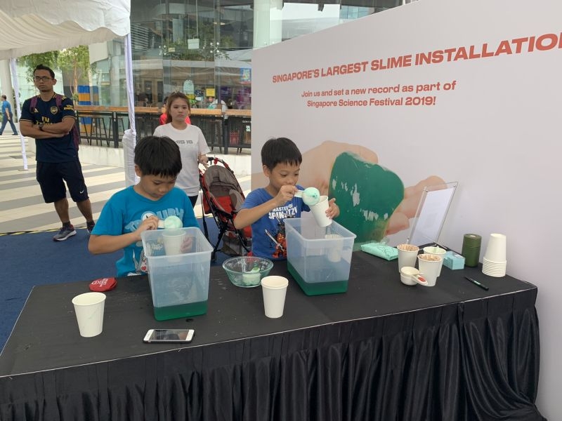 The Agency for Science, Technology and Research (A*STAR) and the Singapore Science Centre organised a two-day science carnival at Fusionopolis from 13-14 Sep 2019. Among the many experiments that the public could have their hands on was the slime-making activity. Slime created was then poured into an acrylic structure which measured 3m long, 0.71 m high and 6cm width.