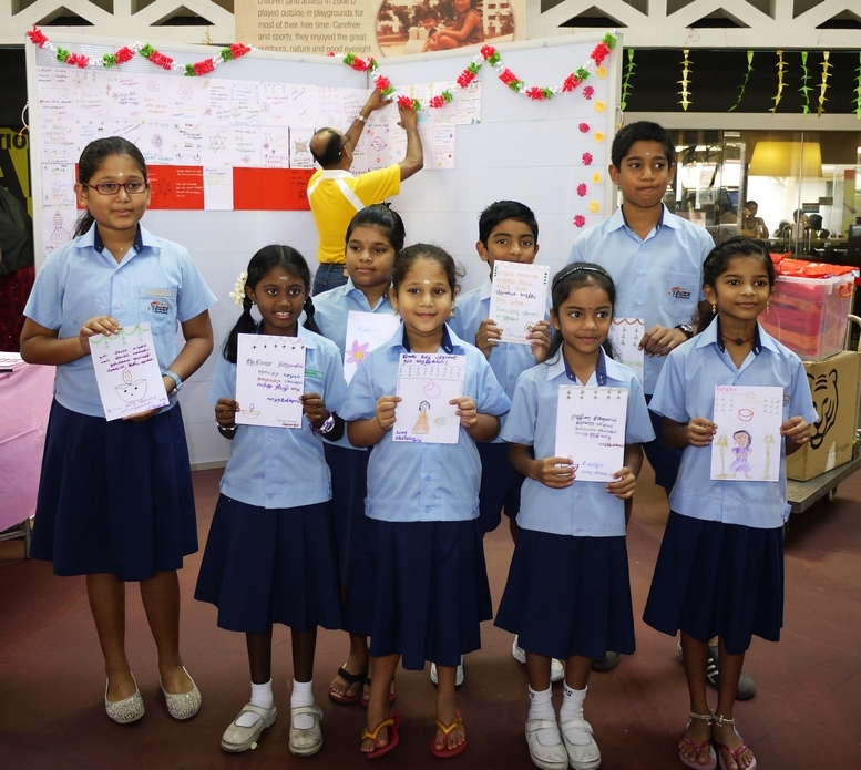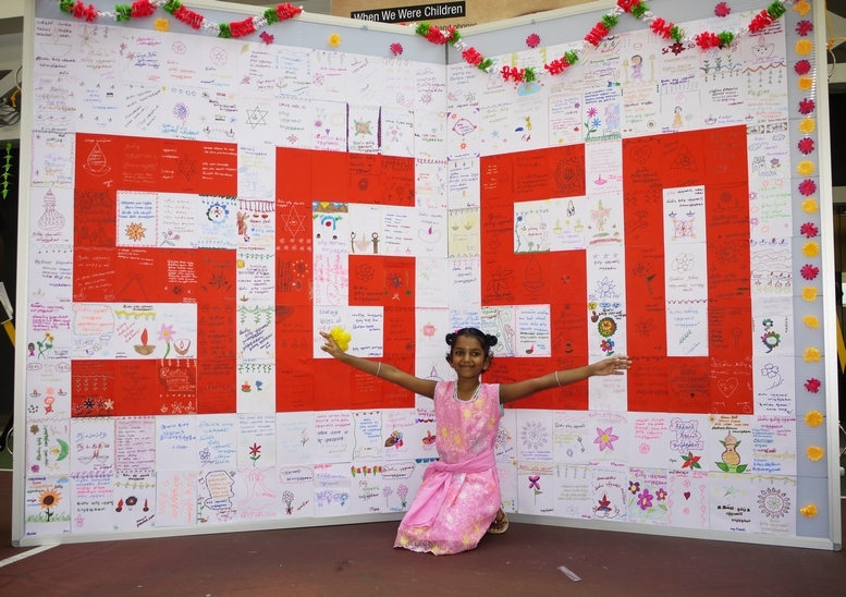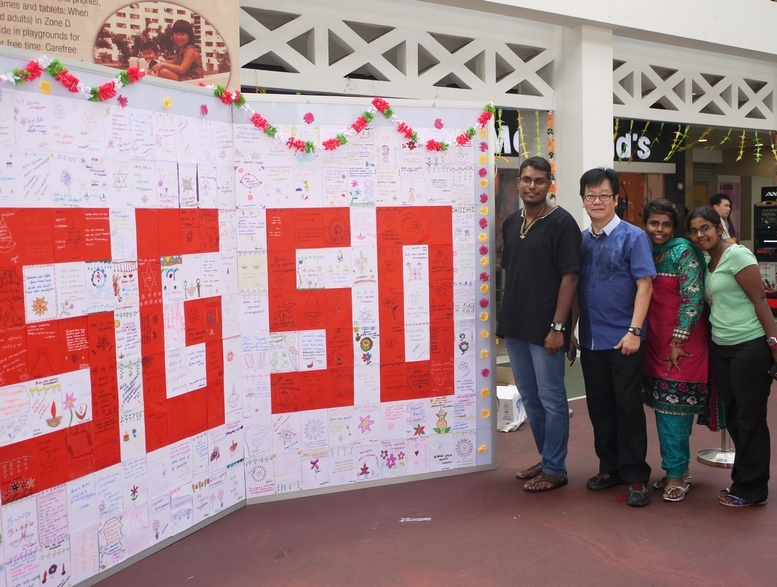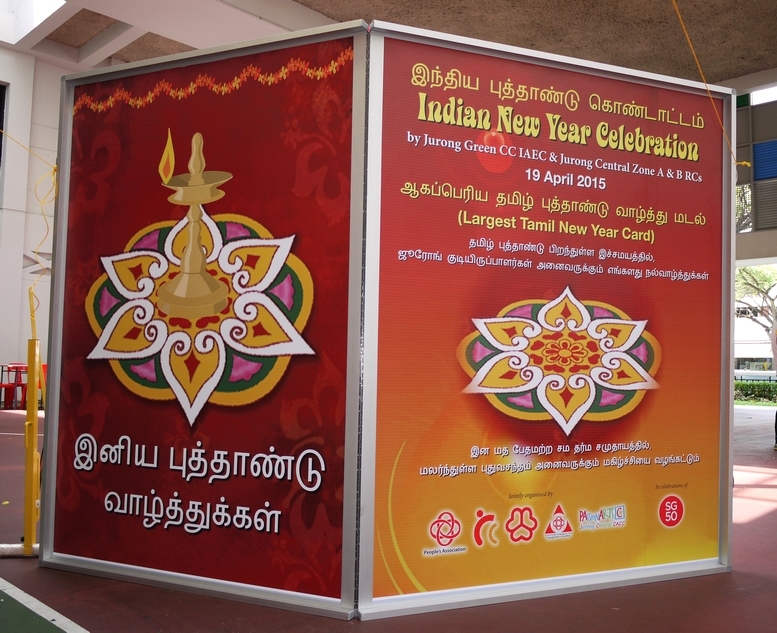 Jurong Green CC IAEC, Zone A and Zone B RCs celebrated Tamil New Year with a record breaking card on 19 Apr 2015. The 3.1m by 2.0m card made of twin-wall polycarbonate was printed with traditional Tamil wishes on one side and blank on the order. Children at the event drew and wrote wishes on pieces of paper which were then pasted on the plain side forming the initials ‘SG50’.