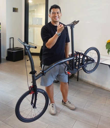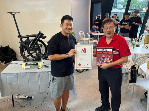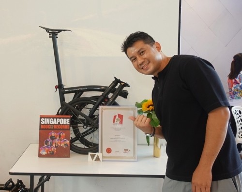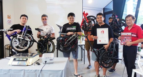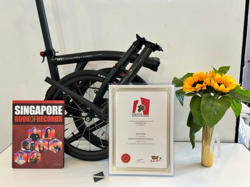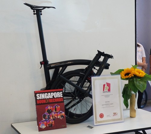 Ng Tze Theng custom-made a super-lightweight folding bike based on the Brompton design. It tips the scales at 3.93 kg, chopping off nearly half the weight of Brompton’s lightest model, the 7.45-kg T-Line. He stumbled upon the CarbonDryJapan frame through a local collector and added customized 3D-printed parts. Ng was awarded the record at his condo clubhouse on 6 Sep 2025.