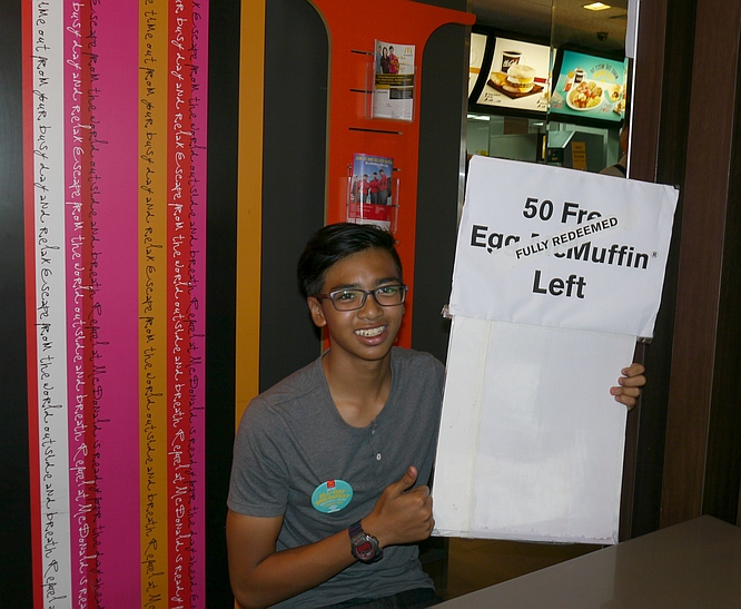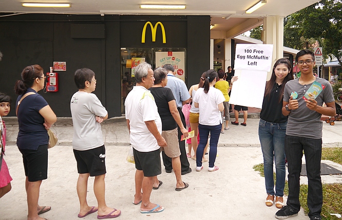 In a worldwide campaign for National Breakfast Day, over 5,000 McDonald’s restaurants gave away free McMuffins. On 17 Mar 2014, 120,102 Egg McMuffins were given out at 121 restaurants throughout Singapore. Starting at 5am for some stores and 7am at others, customers had fully redeemed the 1000 vouchers given out at each store by 10am.