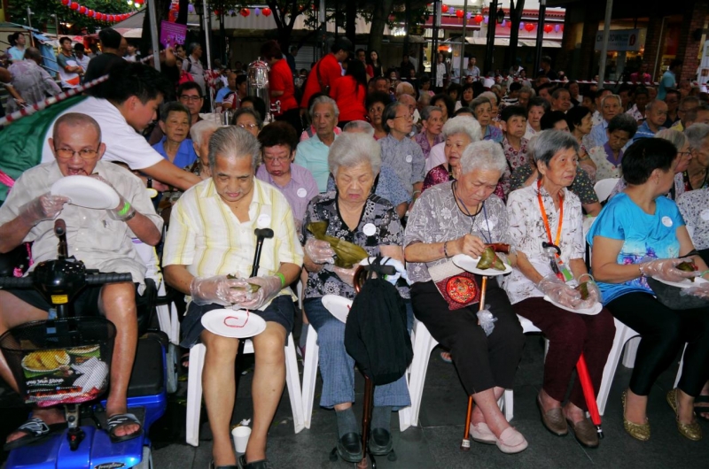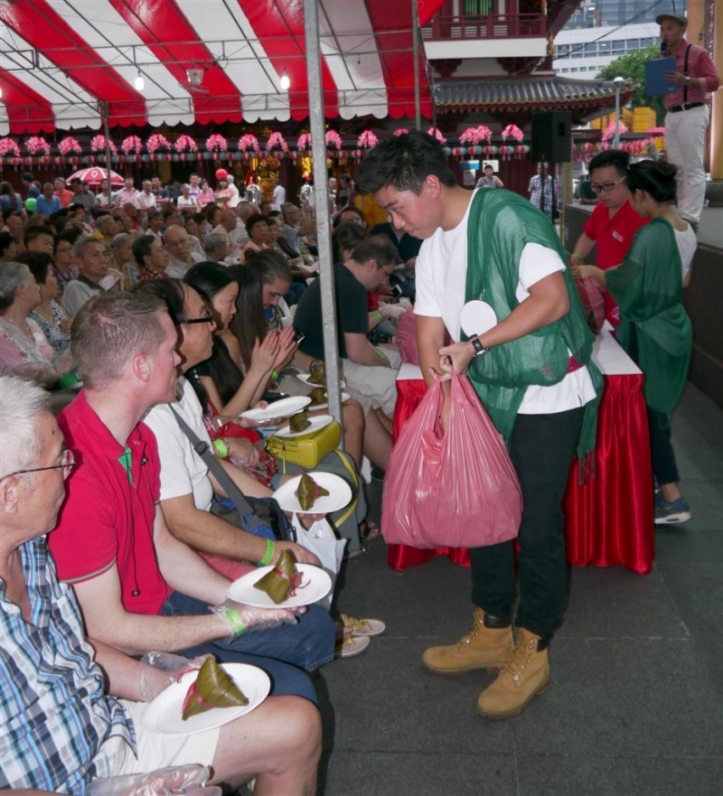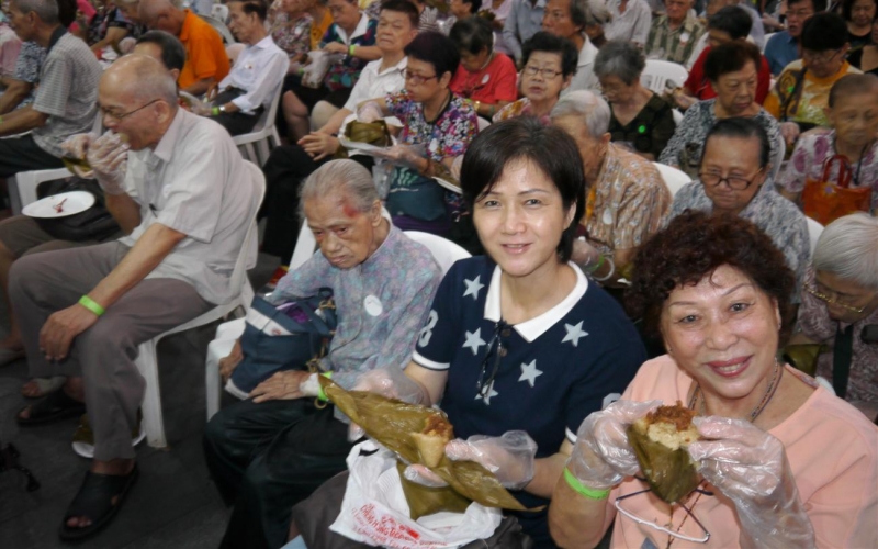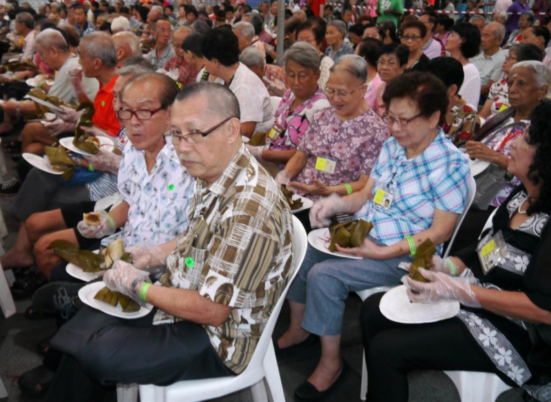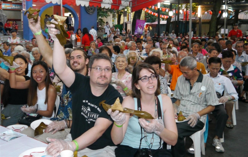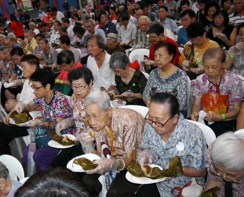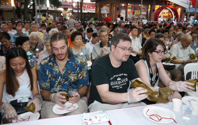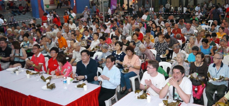 Chinatown Business Association celebrated the dumpling festival with senior residents in the neighbourhood at the Kreta Ayer Square on 14 May 2016. After watching cultural performances, the residents were given a dumpling each accompanied by gloves and a plate. 338 people broke the record for eating dumplings together.