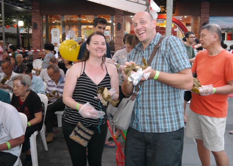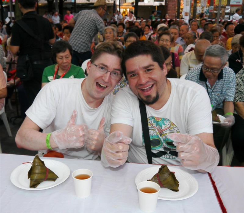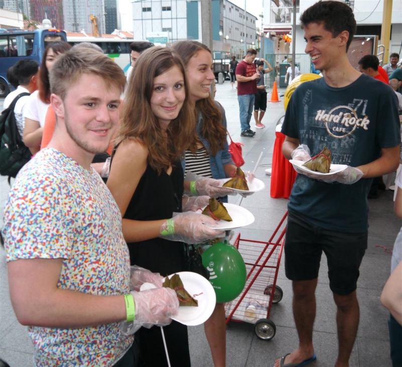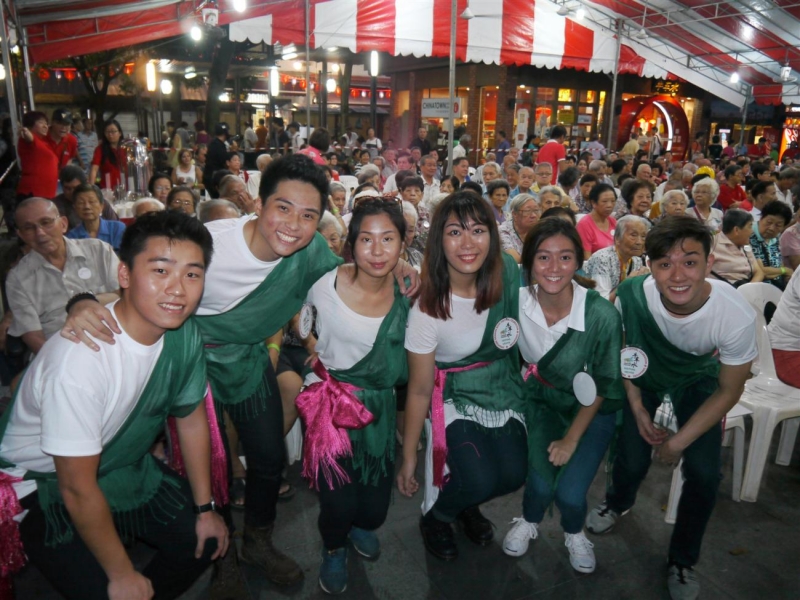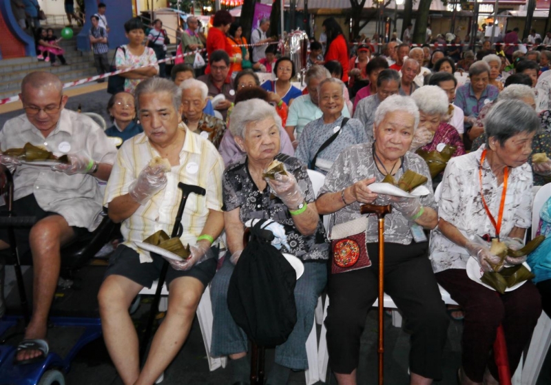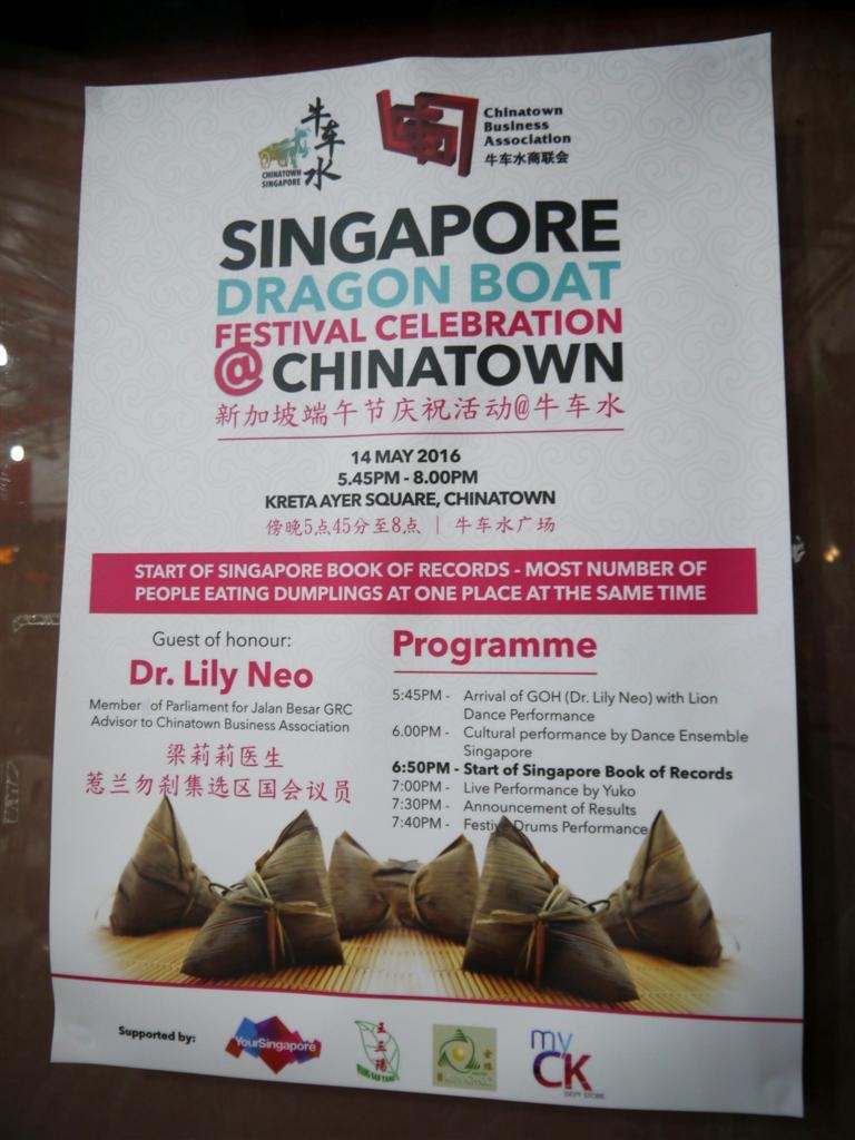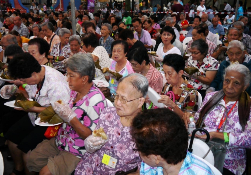 Chinatown Business Association celebrated the dumpling festival with senior residents in the neighbourhood at the Kreta Ayer Square on 14 May 2016. After watching cultural performances, the residents were given a dumpling each accompanied by gloves and a plate. 338 people broke the record for eating dumplings together.