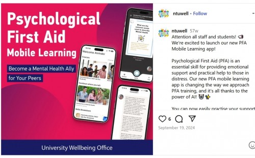 NTU Wellbeing Office pushed for the university community to learn about Psychological First Aid (PFA) through an AI-powered training app developed with Sg Red Cross. The app equips users with practical skills to promptly offer support for those in distress before specialised help is available. For the 2-month period up to 22 Oct, 232 people had learnt about PFA through the app. The record was awarded on 23 Oct 2025.